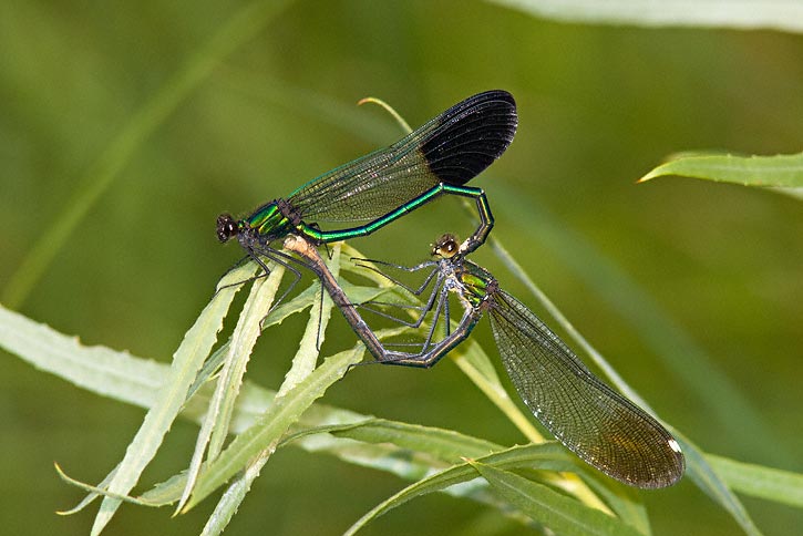 The next 4 images of River Jewelwing were taken along the South Fork John Day River, near Dayville, Grant Co., Oregon, in July, 2008, with a Canon EOS 1D Mark III and EF 300mm F/4 L IS lens and 2X extender. The first 2 shots show a male, then the 3rd shot down shows a female, and the 4th image shows a pair in copula. | ![]() |