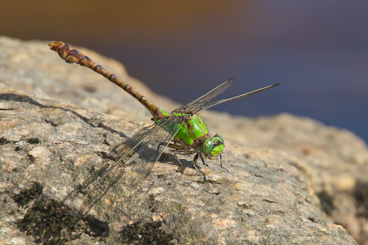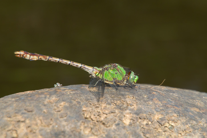 The Rusty Snaketail (Ophiogomphus rupinsulensis) inhabits flowing clear streams and rivers in the northeastern third of the U.S., and parts of southeast Canada. It ranges south into the Appalachians to Kentucky and Tennessee. It can be fairly common in the right habitat. The first three shots here were taken on the Petawawa River, Renfrew Co., Ontario, Canada, in July, 2005, with a Canon EOS 1D Mark II and EF 300mm F/4 L IS lens with a 2X extender and 580 EX flash. This species was quite common at this location and many of them could easily be seen foraging over some shallow rapids. | ![]() |