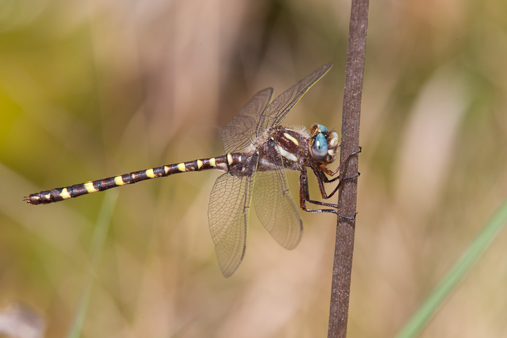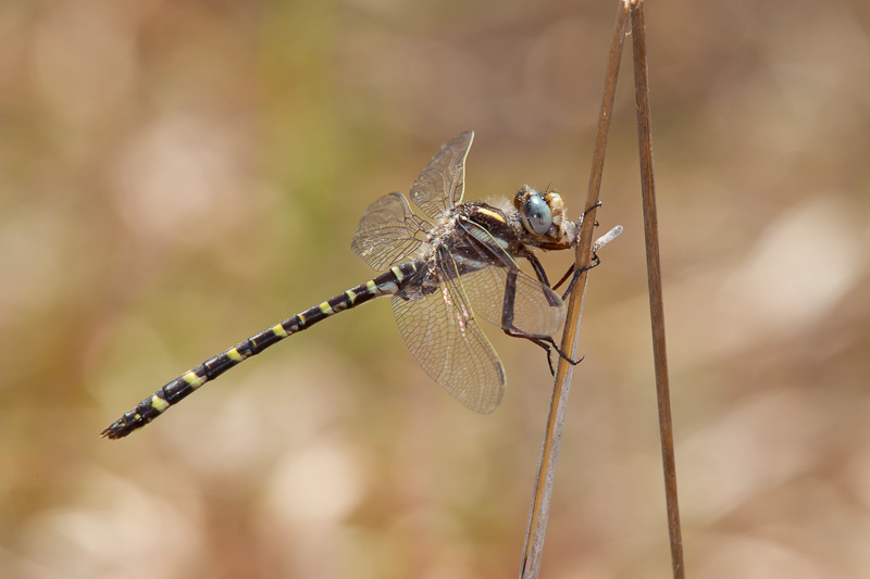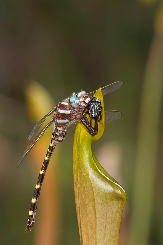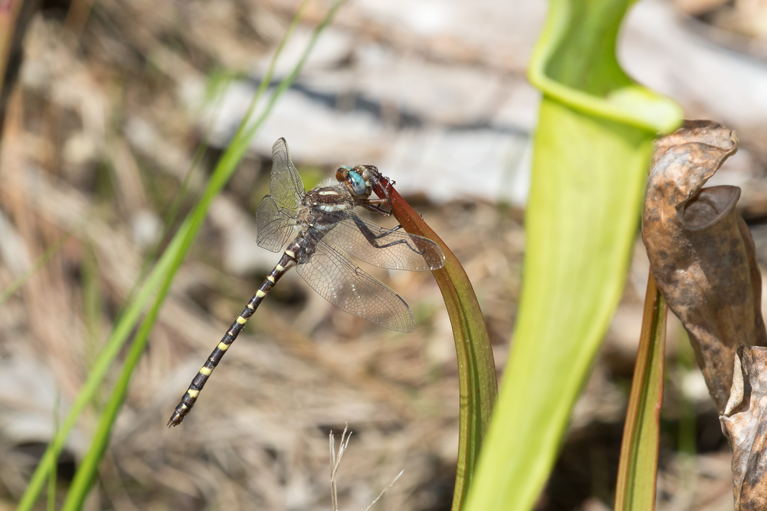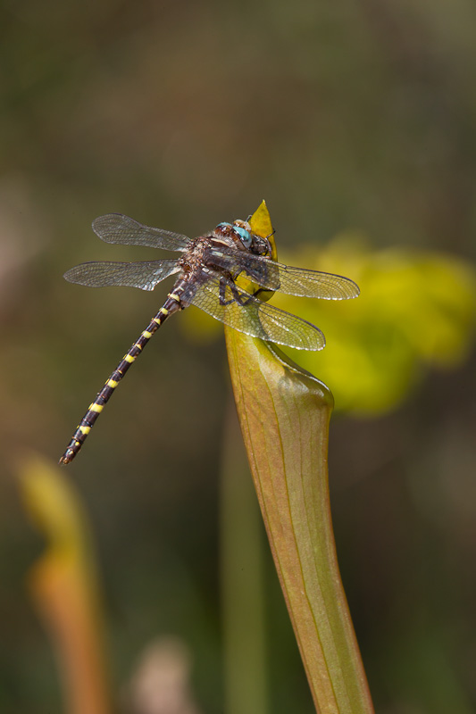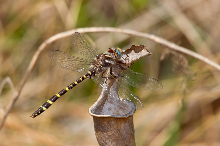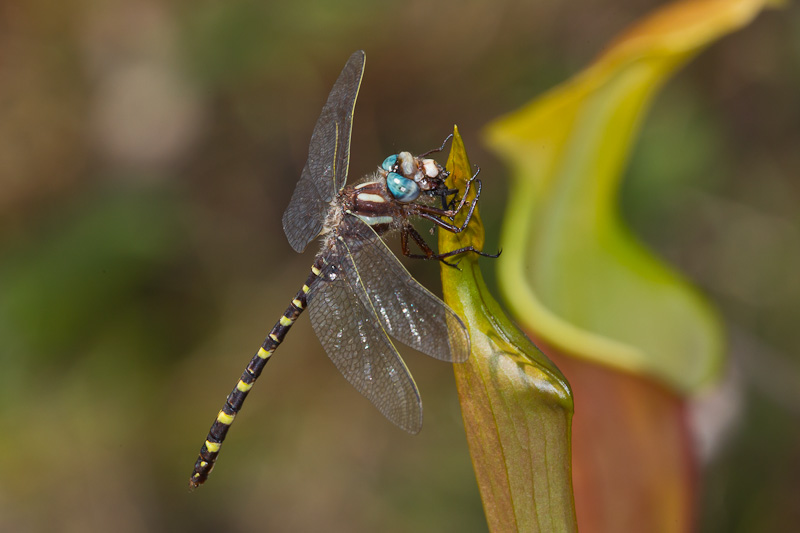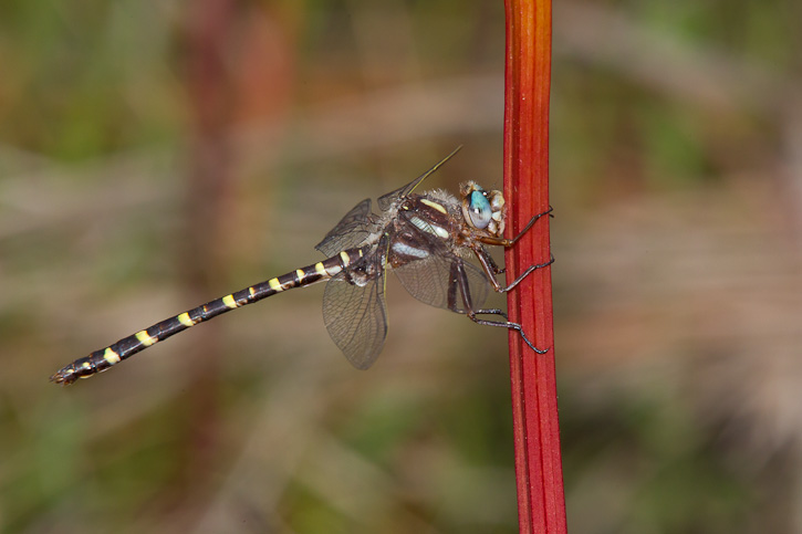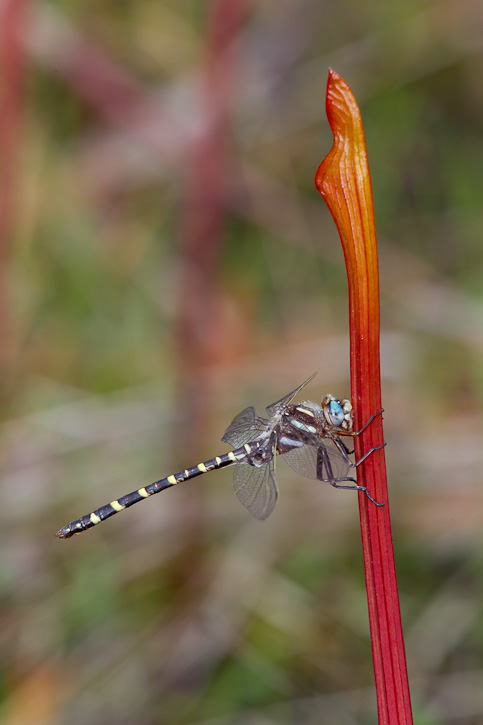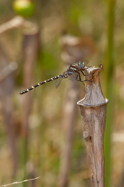 The Sarracenia Spiketail (Cordulegaster sarracenia) was described new to science in 2011 by John C. Abbott and Troy D. Hibbitts. An abstract of the Zootaxa PDF article describing this new species is available here. The full article should be available on the Internet soon, but until then if you would like a copy of the article please contact me and I will send you the PDF of it. The full article describes the original discovery of this new dragonfly and the research that has gone into this species so far. Currently, Sarracenia Spiketail is known only from five counties in east Texas and one parish in adjacent western Louisiana. The species has only been found in and around boggy areas containing the pitcher plant Sarracenia alata. This is also a very early species, with flight dates currently known between 14 March and 29 April. In 2011 they were not found after about 11 April. On the right is a male Sarracenia Spiketail perched on the red stem of a new pitcher plant in the Kisatchie National Forest, Natchitoches Parish, Louisiana, in early April, 2011. This shot was taken with a Canon EOS 1D Mark IV and a Sigma 50-500mm lens and Canon 580 flash. | ![]() |