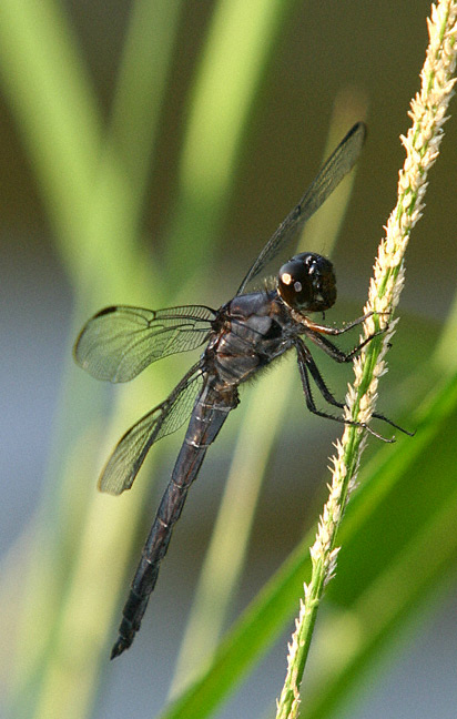 The Slaty Skimmer (Libellula incesta) is an all black skimmer of the southeastern U.S. It can be very common in parts of east Texas. The first digital captures here were all taken in June, 2003, in east Texas and were shot with a Canon EOS 10D and EF 70-200 mm F2.8 L IS lens with a 2X extender and 550 EX flash. The first shot of a male was taken in the Angelina National Forest, Angelina Co., Texas. | ![]() |