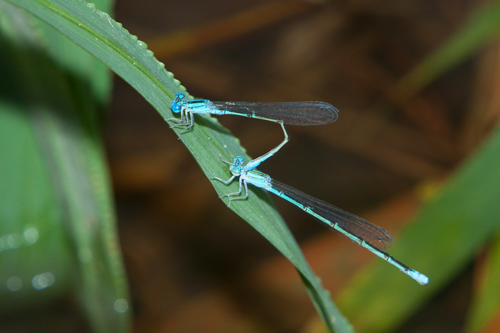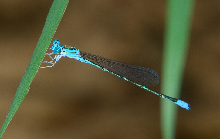 The Slender Bluet (Enallagma traviatum) is a pond damselfly of the eastern United States. Its range extends westward to east Texas which is where the first 4 shots on this page were taken in May, 2009. These images were taken with a Canon EOS 50D and an EF 70-200mm F/2.8 L IS lens and 2X extender and 580 flash in the Sam Houston National Forest, San Jacinto Co., Texas. The shot shown here shows a pair in tandem. |