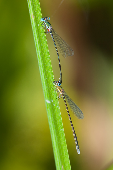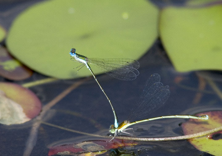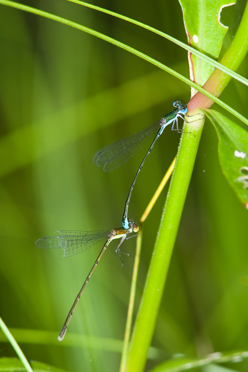 The Southern Sprite (Nehalennia integricollis) is a widespread tiny damselfly of the eastern United States. It is a common species on many ponds and marshes. The first shot on this page, of a pair in tandem, was taken in Taylor Co., Georgia, in July, 2005. This digital image was taken with a Canon EOS 1D Mark II and EF 300mm F/4 L IS lens with a 2X extender and 580 EX flash. | ![]() |