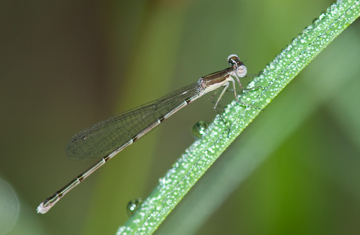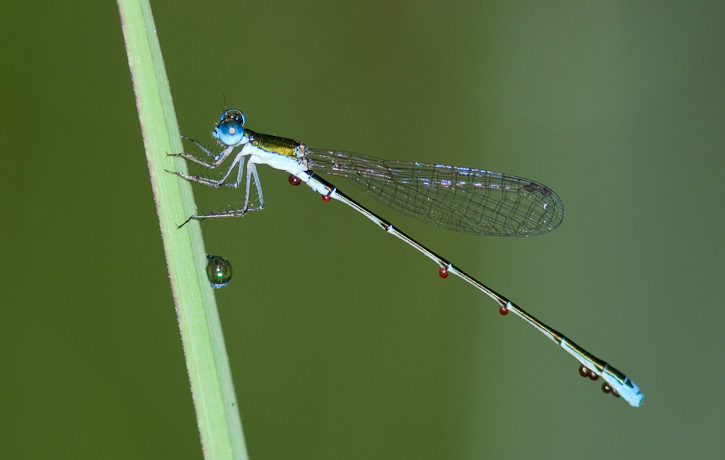 The male shown here was perched on a grass blade next to a drop of dew. Note the water mites under the abdomen of this individual. | ![]() |
