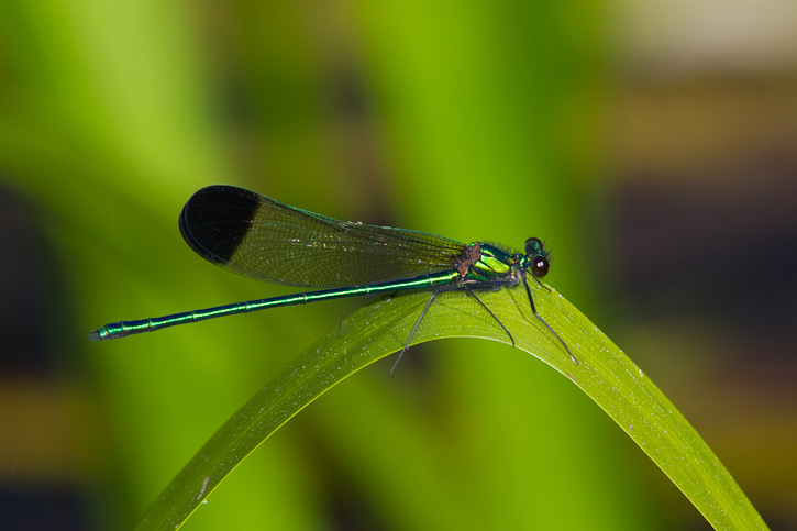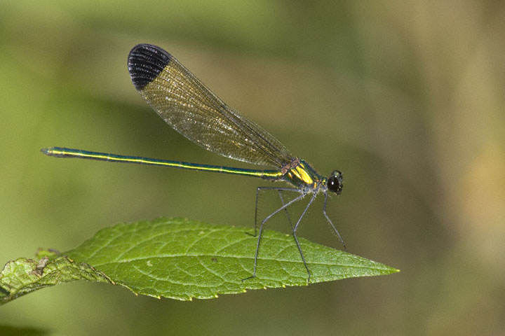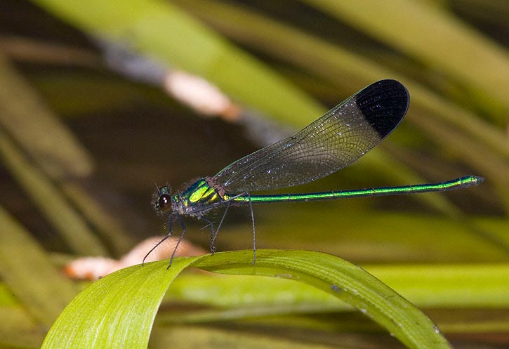 The Sparkling Jewelwing (Calopteryx dimidiata) is a stream damselfly of the eastern United States. Records range from New England southwest to east Texas. The shots here of a male, female and a pair were taken along the Conasauga River, Chattahoochee National Forest, Murray Co., Georgia, in July, 2005. These digital images were taken with a Canon EOS 1D Mark II and EF 300mm F/4 L IS lens with a 2X extender and 580 EX flash. |