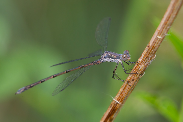 The Spotted Spreadwing (Lestes congener) is a widespread damselfly ranging across much of the United States except for the deep south and Texas. The two black marks on the underside of the thorax is where it gets its common name. The first ten shots on this page were taken on the Brett Gray Ranch, a Nature Conservancy property, in Lincoln Co., Colorado, in July, 2011. These shots were taken with a Canon EOS 1D Mark IV and a Sigma 50-500mm lens and Canon 580 flash. The one of the right is a teneral individual. | ![]() |
