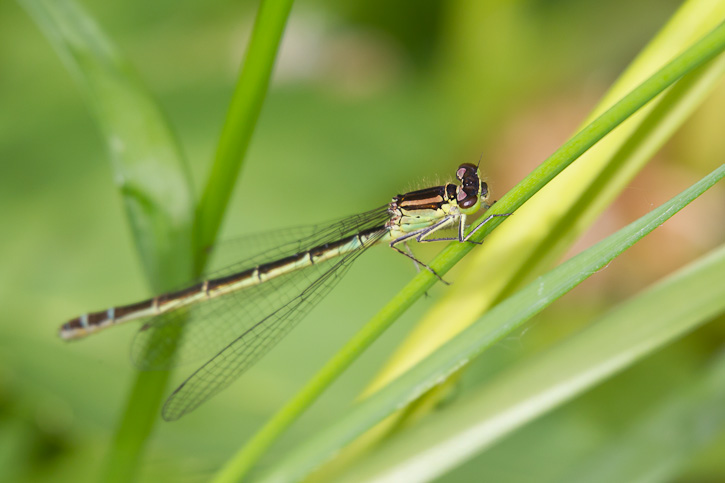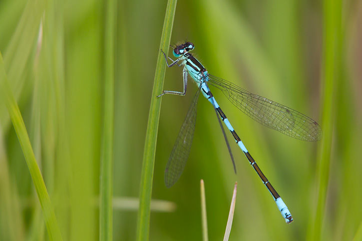 The Taiga Bluet (Coenagrion resolutum) is widespread and common in marshes across the northern United States. In some areas it is only found at higher elevations. The first nine shots on this page were taken at Parvin Lake, near Fort Collins, Larimer Co., Colorado, in July, 2011, with a Canon EOS 1D Mark IV and a Sigma 50-500mm lens and Canon 580 flash. A male is shown in the first two images. | ![]() |