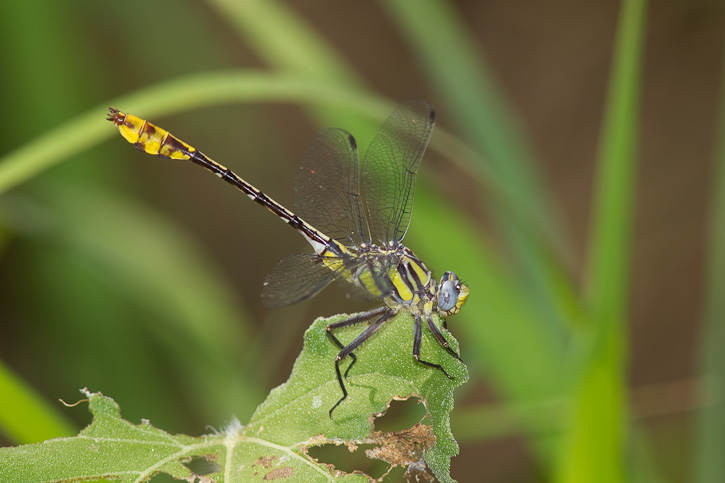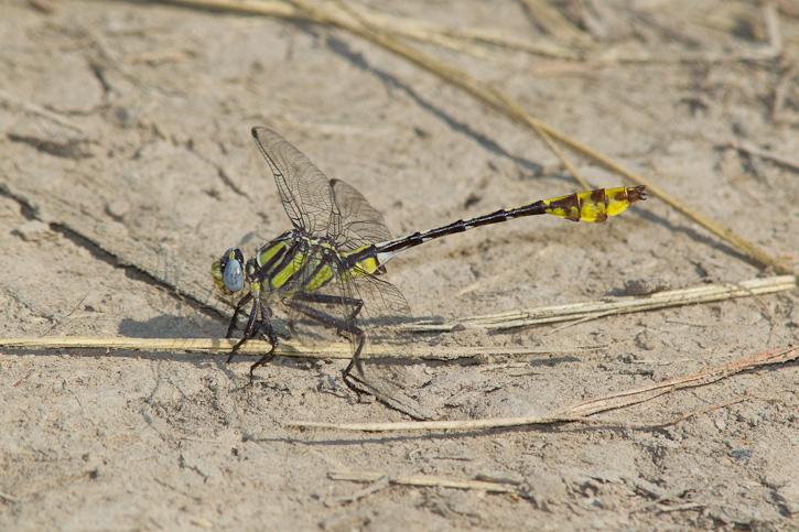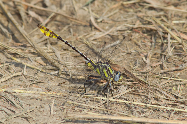 The next 6 shots of male Tamaulipan Clubtails were taken near Mission, Hidalgo Co., Texas, in May, 2010, with a Canon EOS 1D Mark IV and an EF 300mm F/4 l IS lens and 2X extender and 580 flash. This dragonfly is quite similar visually to both Sulphur-tipped Clubtail (G. militaris) and Plains Clubtail (G. externus), but shows a 5th thorasic stripe that those 2 species lack as well as a different pattern on the abdomen and club. The legs also also dark which further separates it from Sulphur-tipped. |