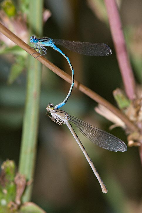 The Tule Bluet (Enallagma carunculatum) is a widespread and common damselfly across most of the United States except for the southeastern quarter. It also occurs in many portions of southern Canada. The species may occur in a wide variety of habitats including ponds and lakes as well as flowing rivers, marshes, bogs, etc. The male in the top image shown here, was at Oxford Reservoir, Franklin Co., Idaho, in July, 2008, and was shot with a Canon EOS 1D Mark III and EF 300mm F/4 l IS lens and 2X extender and flash. The next two shots showing a pair in tandem and a pair in copula were taken along the Yakima River in Benton Co., Washington, in August, 2008. |