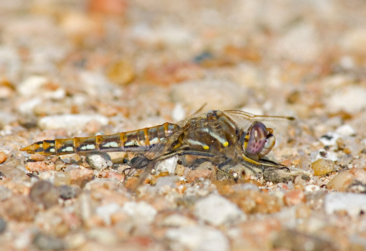 The female Variegated Meadowhawk in the two shots shown next was resting on a gravel road in Austin, Travis Co., Texas, in April, 2007. These shots were taken with a Canon EOS 1D Mark II and EF 300mm F/4 L IS lens and 2X extender. | ![]() |