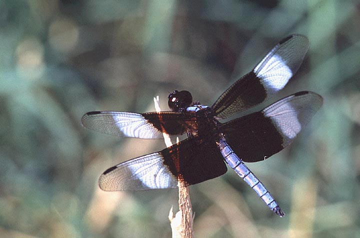 The Widow Skimmer (Libellula luctuosa) is one of the group of dragonflies known as King Skimmers. The species occurs commonly across much of the U.S. except in the higher Rocky Mountain areas. The first male shown on this page was photographed in July, 2002, in Austin, Travis Co., Texas with a Canon EOS 1V and EF 300mm F4 L IS lens with a 2X extender on Fuji Provia film. The next two shots, of a male and a female, were digital captures at the same location in May, 2003, using a Canon EOS 10D and EF 300 mm F4 L IS lens with 1.4X extender. | ![]() |