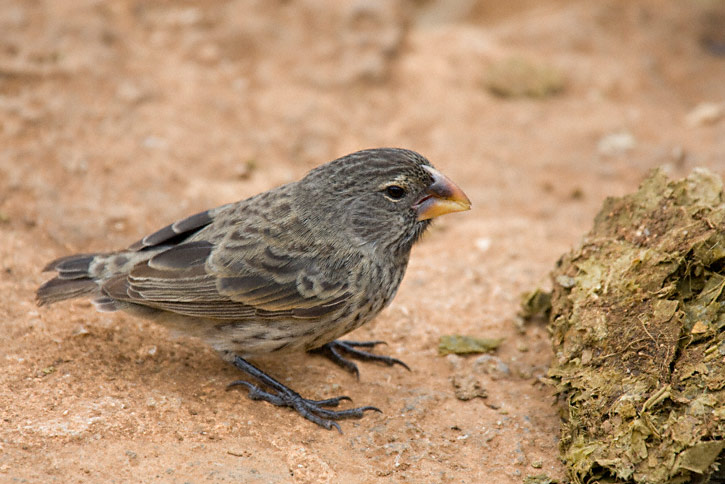 The Medium Ground-Finch (Geospiza fortis) is one of the "Darwin Finches" endemic to the Galapagos Islands. The first 2 shots on this page were digital captures taken in July, 2003. The first shot on Santa Maria and the next shot on Santa Cruz Island with a Canon EOS 10D and an EF 70-200 mm F/2.8 L IS lens and 2X extender. Telling Small, Medium, and Large Ground Finches apart has to do with the bill structure. Darwin's finches (also known as the Galápagos Finches or as Geospizinae) are a group of 15 species of Passerine birds, now placed in the tanager family rather than the true finch family. They were first collected by Charles Darwin on the Galápagos Islands during the second voyage of the Beagle. Thirteen are found on the Galápagos Islands and one on Cocos Island. The birds are all about the same size (10–20 cm). The most important differences between species are in the size and shape of their beaks, and the beaks are highly adapted to different food sources. |