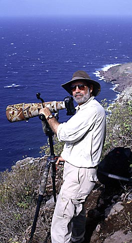 | The photo here was taken of me as I was photographing the tropicbird in the previous image. Don McGehee took the photo as we stood on the edge of a cliff 800 feet above the Caribbean far below. The tropicbirds were investigating nest sites along the top edge of the cliff and would sometimes pass quite close to us allowing me to get a number of nice shots. | ![]() |
