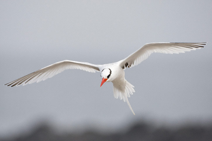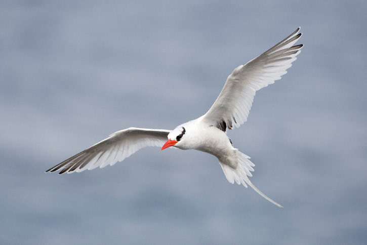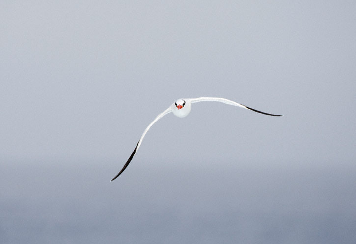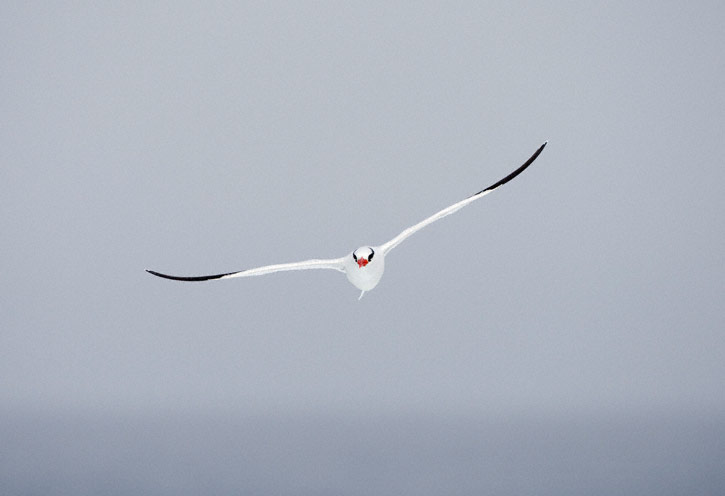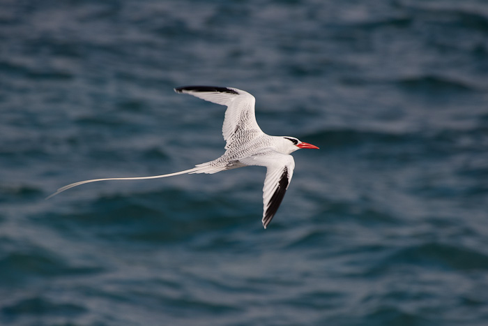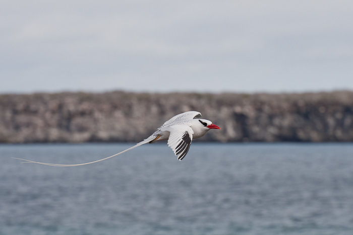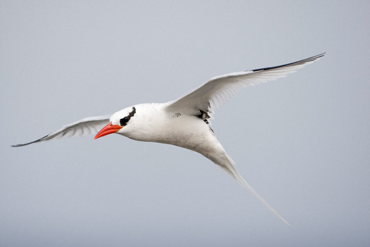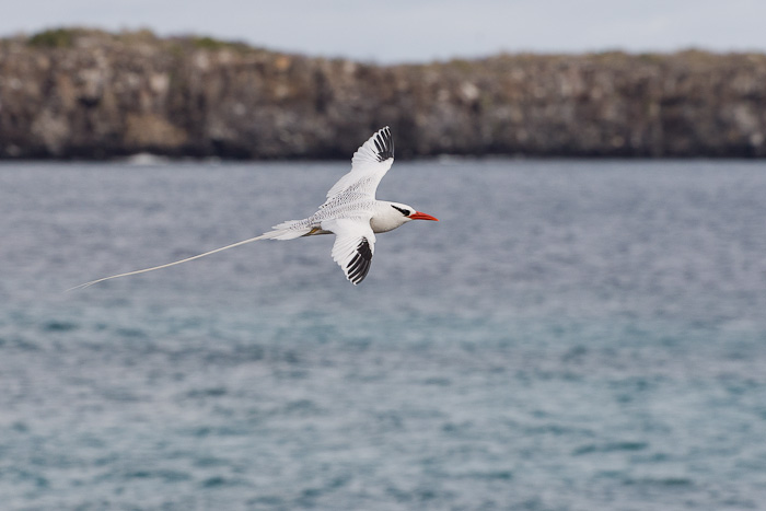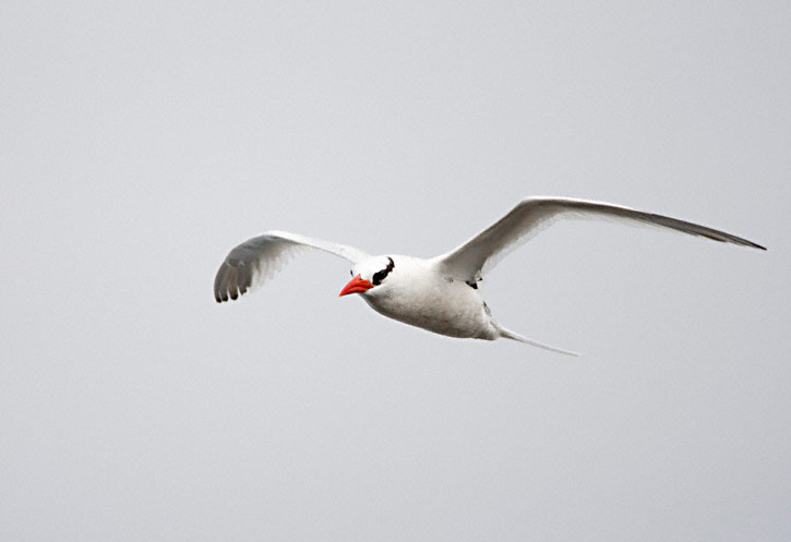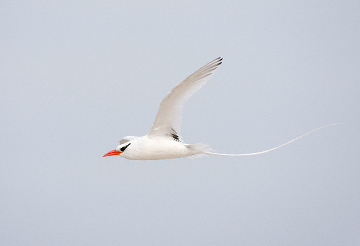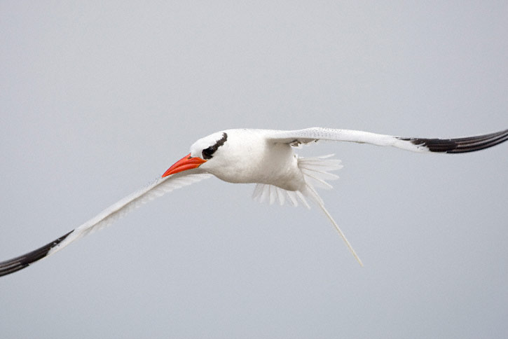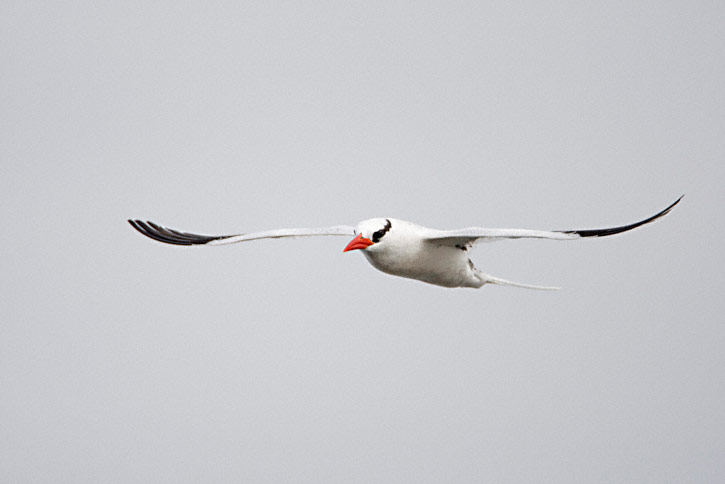 | The next nine images show adult Red-billed Tropicbirds in flight on the Galapagos Islands in August, 2010. These images were all taken with a Canon EOS 1D Mark IV and a Sigma 50-500mm lens. The bird at right was on Plazas Island. | ![]() |