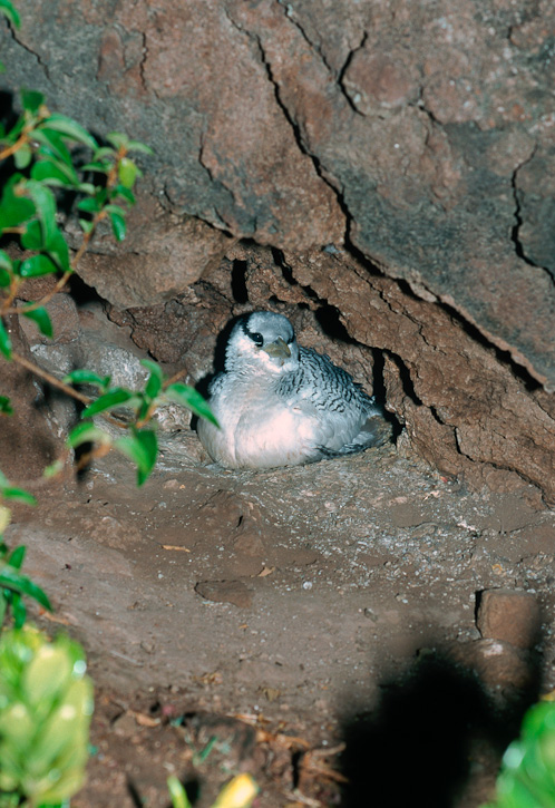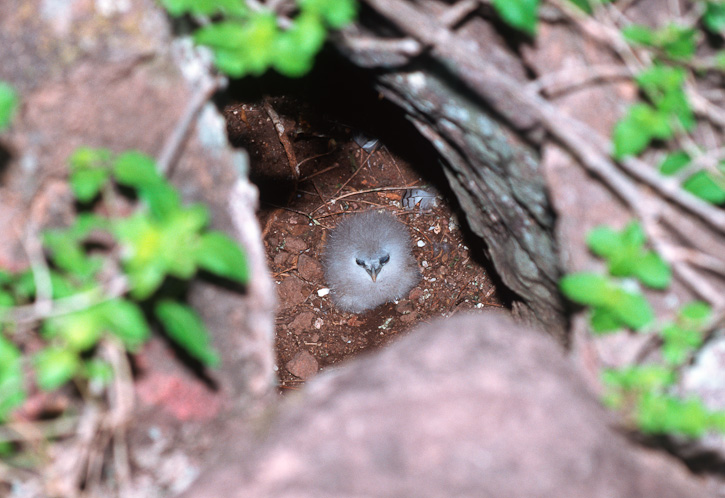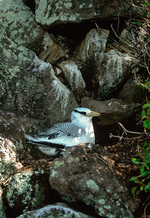 | In July, 1998, I was with a researcher on several occasions while young tropicbirds were being weighed, measured and banded. The opportunity allowed me to get some shots of young birds. These nests were all under the edge of boulders on the ground. These images were taken in July, 1998, on Saba in the Netherlands Antilles. These shots were taken with a Canon EOS 1N on Fuji Velvia film. | ![]() |
