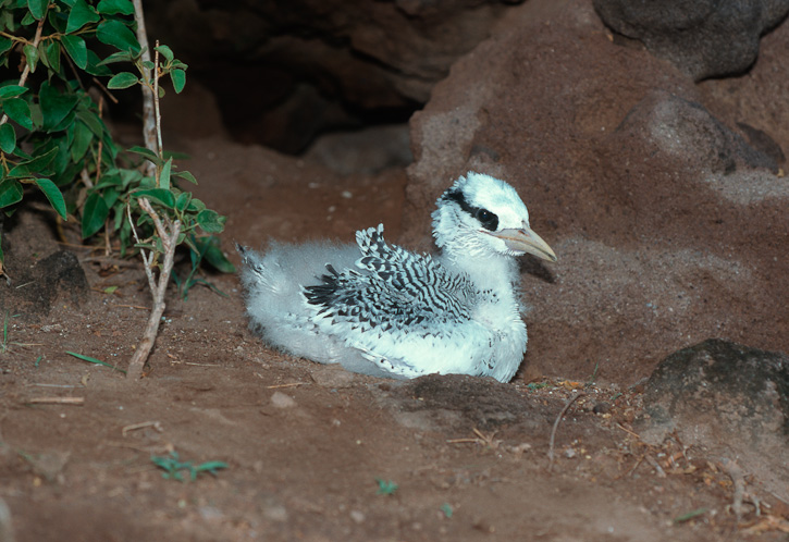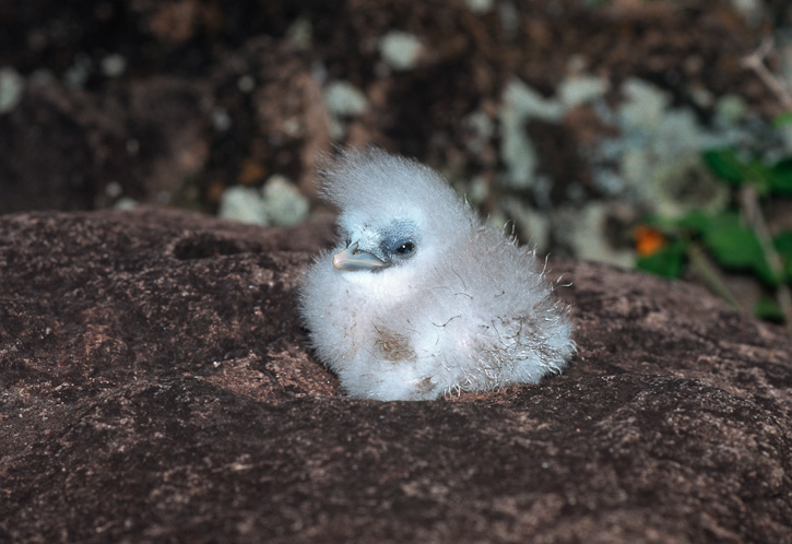 | The next 2 shots show a one-day old tropicbird chick. We had been watching this egg for several days, and finally discovered that the bird hatched July 5, 1998. Bits of the egg shell can be seen around the chick. I learned later from the researcher that this chick fledged September 27. | ![]() |
