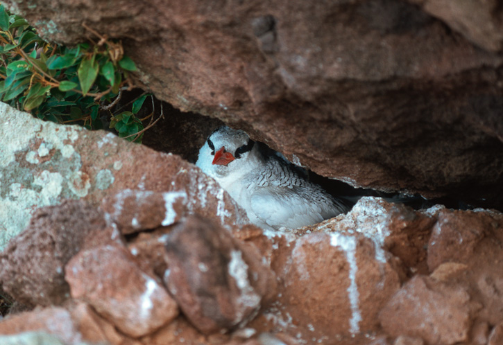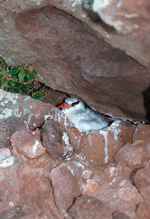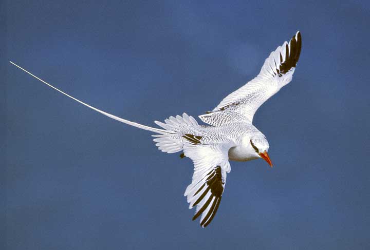 The Red-billed Tropicbird (Phaethon aethereus) nests in cliff crevices, burrows, and other cavities on some islands of the Lesser Antilles, the Galapagos Islands and elsewhere. As the adult birds approach the nesting areas, they are typically moving very fast and are hard to photograph. On a visit to Saba Island in the Netherlands Antilles in 1998, I made a number of attempts to get quality photos of the birds in flight, but never got the shots I was hoping for. I was able to return in 2001 and was finally successful in getting some nice images. The adult here was photographed on the island of Saba in the Netherlands Antilles in July, 2001, with a Canon EOS 3 and an EF 500 mm F4 IS lens on Fuji Velvia pushed one stop. I have friends who used to live on Saba who were involved in a research project with this species, so we were able to see a nesting site up close. See the photos below for some examples of nest sites. Red-billed Tropicbirds are regular visitors to the United States but they do not nest here. For more information on this species, see the Arkive website account of this species which features some of my images. More images follow of Red-billed Tropicbirds in the Galapagos in 2007 and 2010.