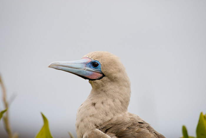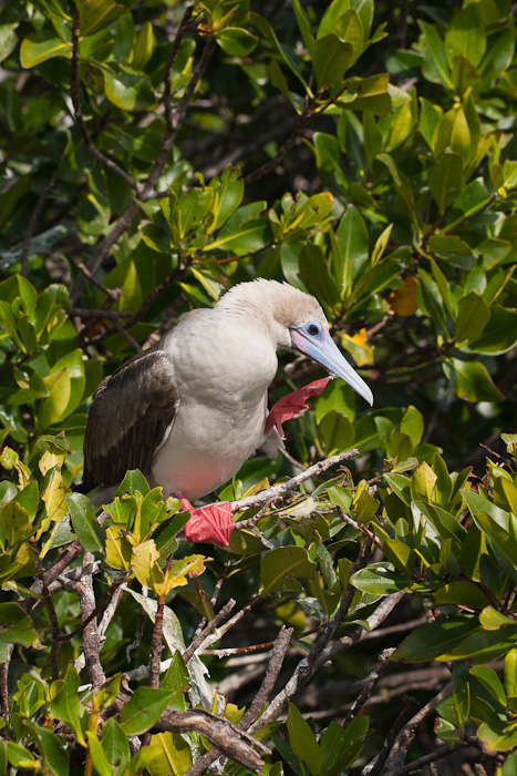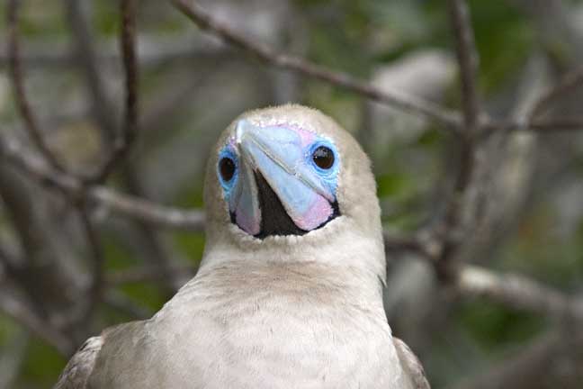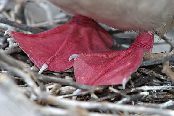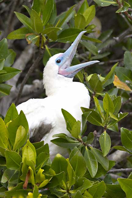 | The Red-footed Booby (Sula sula) is a widespread pelagic species of the Pacific Ocean and parts of the Gulf of Mexico and Caribbean. It nests in shrubs and trees on islands. The species has two color morphs, white and brown, both of which display bright red feet in the nesting season. The shots shown here were all taken in July, 2003, on the Galapagos Islands where the species is very common. Like the Blue-footed Booby, there is certainly no question about how this bird earned its common name! All the photos were digital captures with a Canon EOS 10D and an EF 70-200 mm F/2.8 L IS lens. The white morph bird was sitting on a nest and happened to yawn while I was standing nearby and allowed this interesting shot. See below for more photos. |