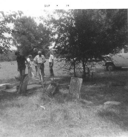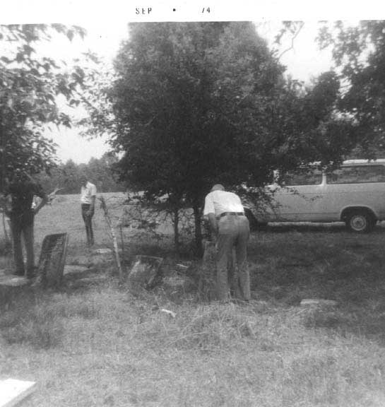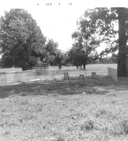 The Joshua T. Hardy cemetery near Siloam, Clay County, Mississippi is simply a small family plot that was used in the mid 1800s by the Joshua T. Hardy family. This branch of the Hardys moved to Mississippi ca 1836 from Greene and Lenoir Cos., North Carolina. Refer to the Rootsweb family tree at the link above and/or visit my page on the descendants of Sutton Hardy here. This is page 2 about the cemetery so click here to go back to page 1. In October, 2002, we found some photos taken in September, 1974, when the cemetery was judged to be in disrepair. A contingent of the Lasley, Hardy, and Elliott families went to the site, cleaned it up and built a chain link fence around it. The fence is 30 feet on each side in a square. While their intentions were good, this actually caused more harm than good in the long run. The site is about a half mile off the nearest road and is on private farm land, so it is not visited on any regular basis and undoubtedly years or even decades went by between visits. Prior to 1974, cattle grazing in the area kept the grass, trees and brush down from around the headstones, but when the fence was built it kept the cattle out. With cattle fenced out of the plot it became extremely overgrown. At the time of this writing (late 2002) it would be an expensive and major undertaking to totally clear out the trees from among the graves, some of which are now more than 6 inches in diameter. Still, for the historical record, I am posting the 4 known photos taken in September, 1974, when the fence was built.