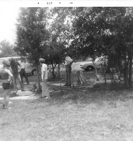 The man standing facing the camera with the white short-sleeved shirt is William H. Lasley, then 58 years old, great grandson of Joshua T. Hardy. The man with the white, short-sleeved shirt facing left is Clyde Dill and the woman facing right is Mary Dill (nee Lasley), sister of William H. Lasley. The young man with the dark shirt is probably Jack Elliott, Jr.