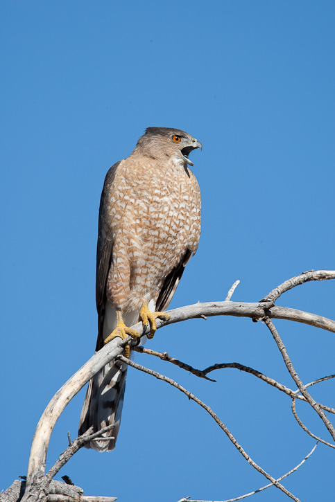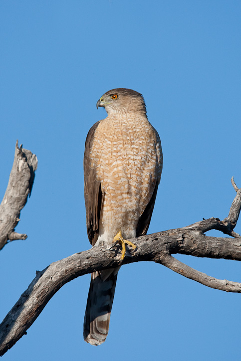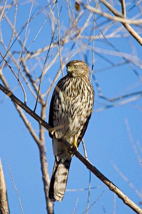 | The Cooper's Hawk (Accipiter cooperii) is a widespread hawk in North America and Mexico. It is in the group of hawks known as Accipiters which have relatively short, rounded wings and long tails. These birds are known for their ability to catch other birds and for their excellent agility in dense brush. The immature bird shown at right was photographed at Bosque del Apache N.W.R., Socorro Co., New Mexico in November, 2005, with a Canon EOS 1D Mark II and EF 600mm F/4 L IS lens and 1.4X extender. |