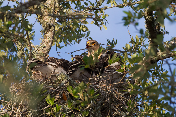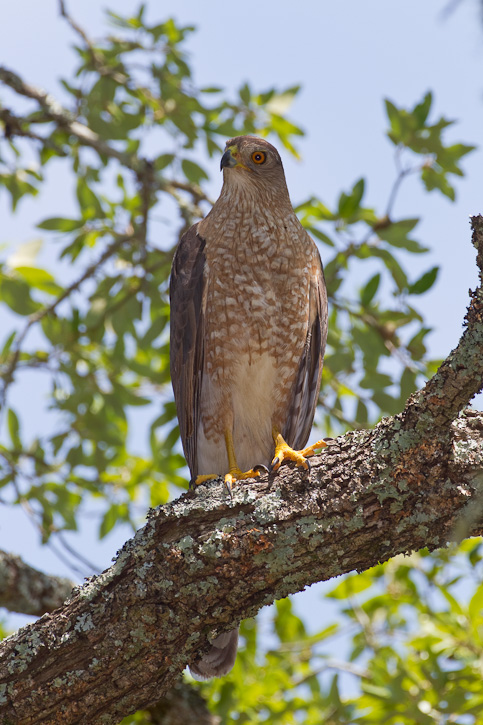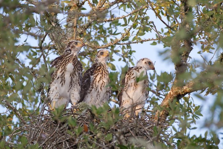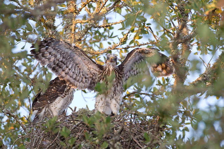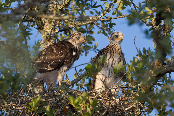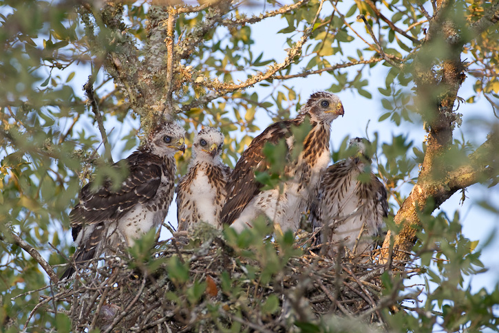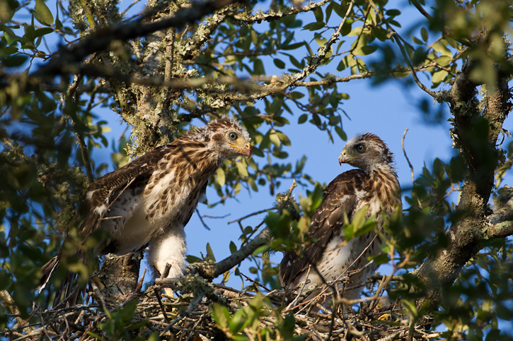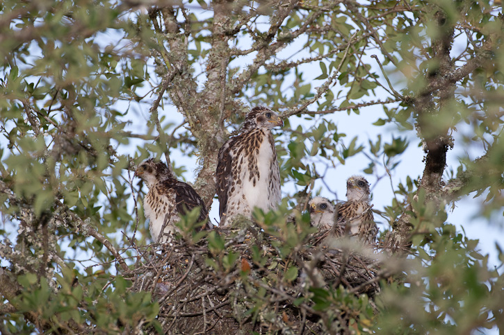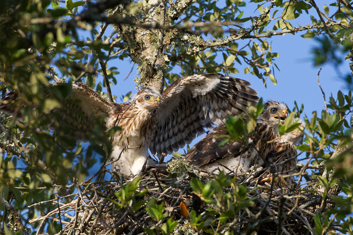 | In June, 2011, some friends invited me to their house just west of Austin, Travis Co., Texas, where a pair of Cooper's Hawks were nesting. There were four youngsters in the nest. The next series of images shows the adults as well as the young birds in the nest. The youngsters fledged just a few days after these shots were taken. These shots were taken with a Canon EOS 1D Mark IV and an EF 500mm F/4 L IS lens. |