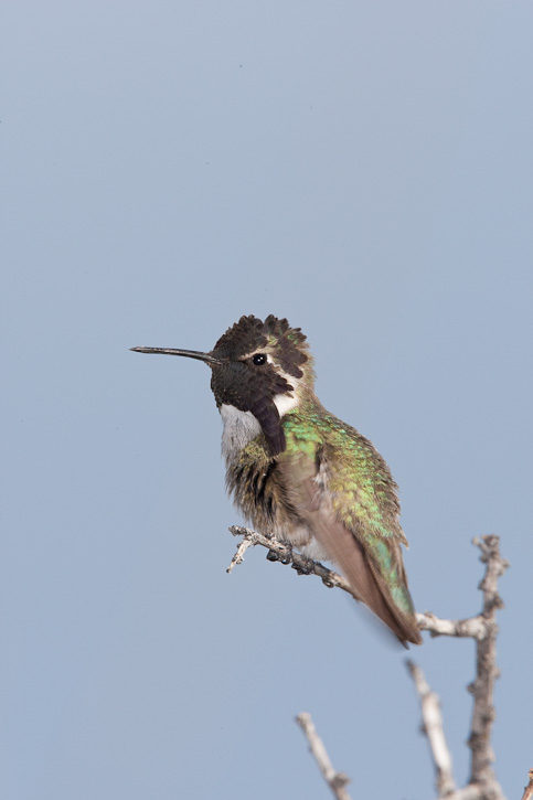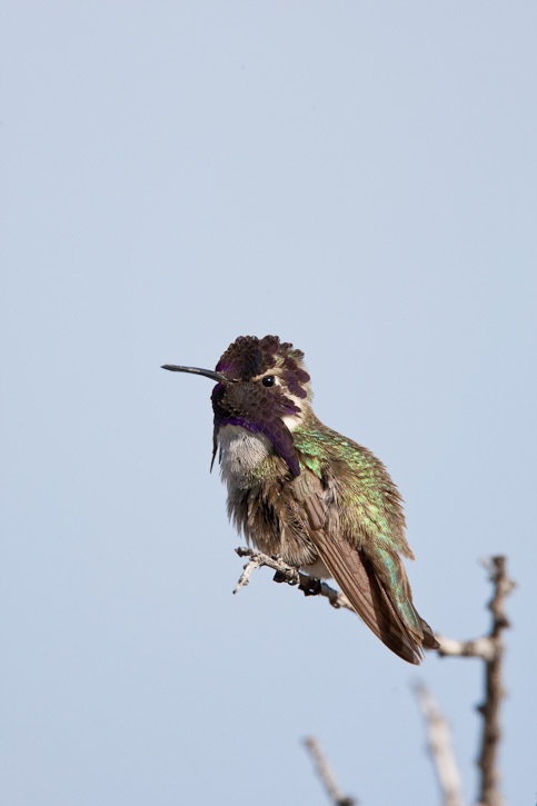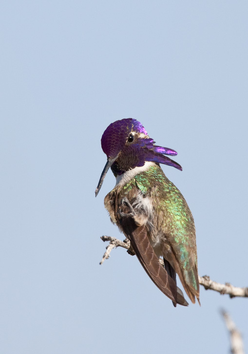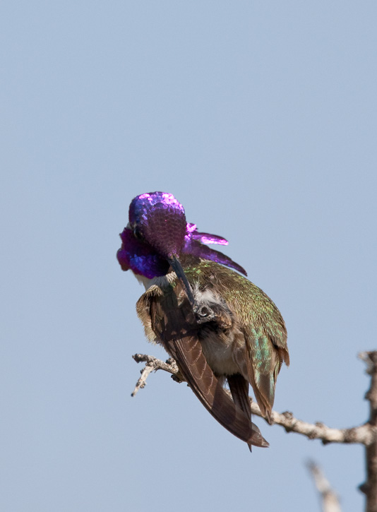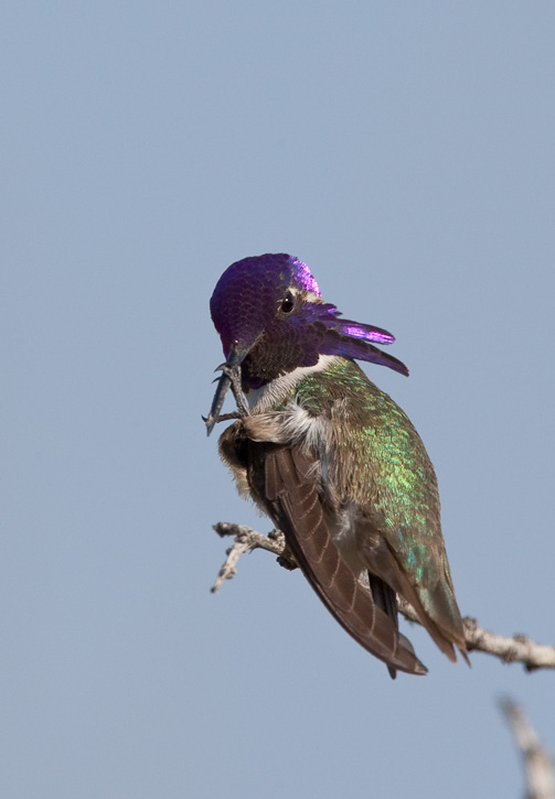 | The Costa's Hummingbird (Calypte costae) is a species of the deserts of the southwestern United States but it has wandered east to south Texas and north to Canada. The species is also common in parts of northern Mexico. The first 6 images on this page show a male in Catalina, Pima Co., Arizona, in March, 2009. Hummingbirds are often seen wiping their bills on a limb or twig, apparently removing debris or other substance from the bill. This male, interestingly, was cleaning its bill by grasping it with its foot and pulling the bill through the clenched foot. I had never seen this behavior before. These images were taken with a Canon EOS 1D Mark III and EF 800mm F/5.6 L IS lens. |