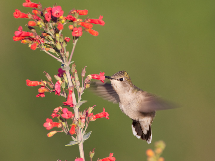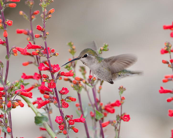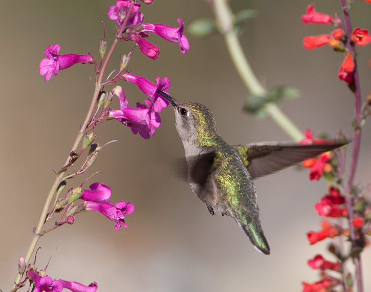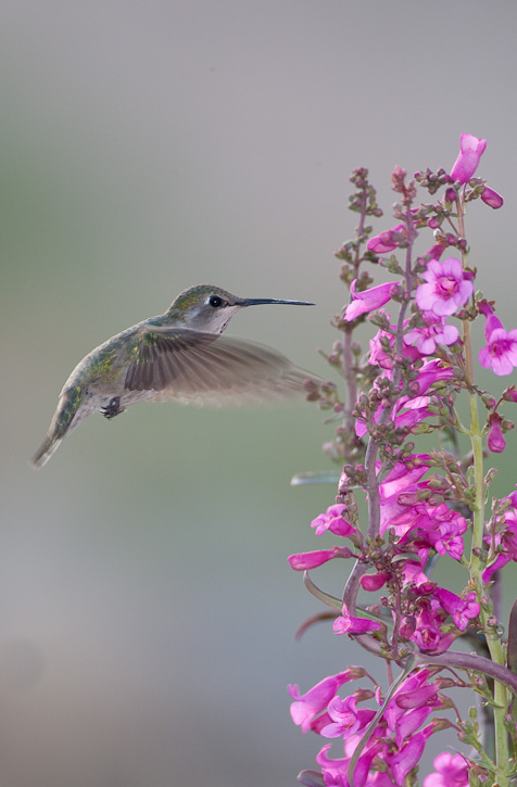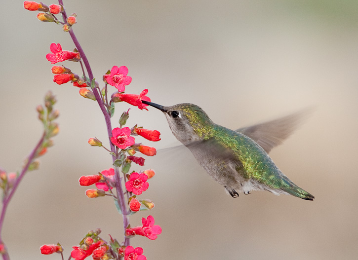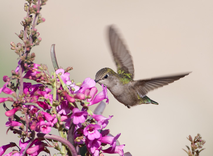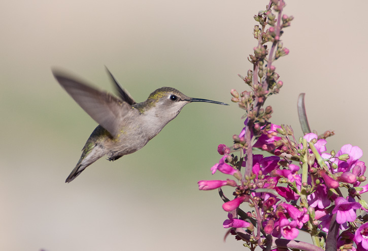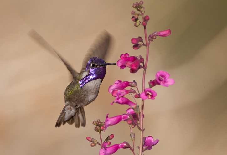 | The next 8 shots show a male (top image only) and female Costa's Hummingbirds, feeding on penstemon blooms in Catalina, Pima Co., Arizona, also in March, 2009. These images were also taken with a Canon EOS 1D Mark III but with an EF 500,, F/4 L IS lens and 1.4X extender. |