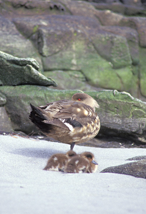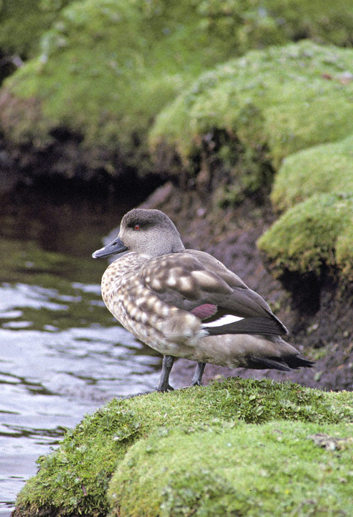 | The Crested Duck (Anas specularioides) is a duck native to parts of South America and the Falkland Islands. It is sometimes called Patagonian Crested Duck or Andean Crested Duck. The two shots on this page were taken in January, 1996, at Sea Lion Island on the Falklands, with a Canon T-90 and FD 400mm F/4.5 lens on Fuji Sensia film. | ![]() |