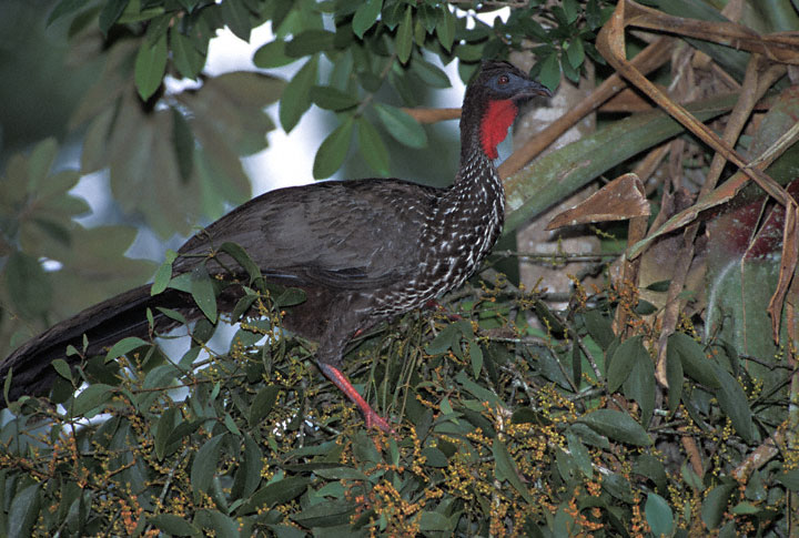 | The Crested Guan (Penelope purpurascens) occurs on both slopes of Mexico from southern Tamaulipas and Sinaloa south through Central America to northern South America. The species is hard to find in areas where it is hunted, but can be commonly seen in areas where protected. The bird shown here was photographed in December, 1999, at Chan Chich Lodge near Gallon Jug, Belize. The shots were taken with a Canon EOS 3 and EF 300mm F2.8 L lens and 2X extender and flash on Fuji Velvia film. | ![]() |