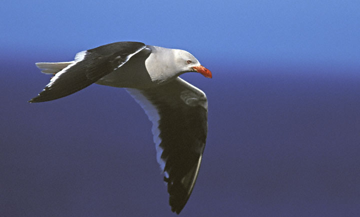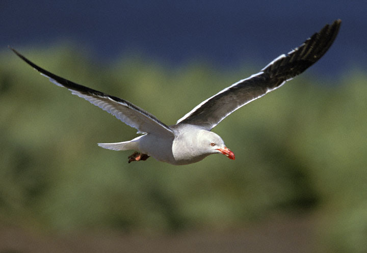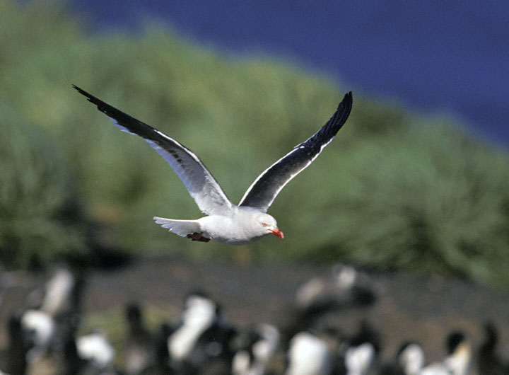 | The Dolphin Gull (Larus scoresbii) is an uncommon gull of extreme southern South America in Argentina and Chile. It also occurs on the Falkland Islands. The bird at right was perched on a tie-down rope of a cruise ship at Ushuaia, Argentina on the Beagle Channel, in February, 2003. The shot was taken with a Canon D60 and EF 70-200 F/2.8 L IS lens and 2X extender. The next three shots show Dolphin Gulls in flight as they patrolled a shag colony at Bleaker Island in the Falklands in February, 2000. These gulls are on the watch for any injured chick or unguarded egg so that they might get a meal. These were shot with a Canon EOS 1N and EF 70-200mm F/2.8 L lens and 1.4X extender on Fuji Velvia. |