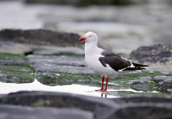 | This shot is from January, 1996, on Sea Lion Island in the Falklands and shows a Dolphin Gull standing along a rocky shoreline. This was taken with a Canon T-90 and an FD 400mm F/5.6 lens on Fuji Sensia. |