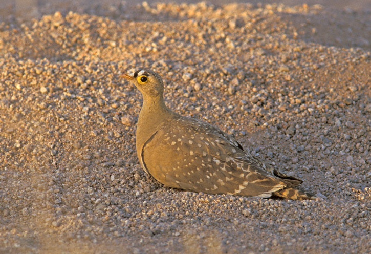 | The Double-banded Sandgrouse (Pterocles bicinctus) is widespread and fairly common across much of the arid regions of southern Africa. The first image was taken in the Huab River Valley, Namibia, in October, 1998, with a Canon EOS 1N and EF 300mm F/2.8 L lens and 2X extender on Fuji Sensia film. The next image was taken in Etosha National Park, Namibia, in October, 1998, with the same equipment. | ![]() |