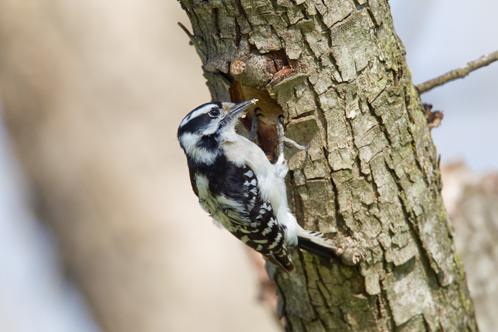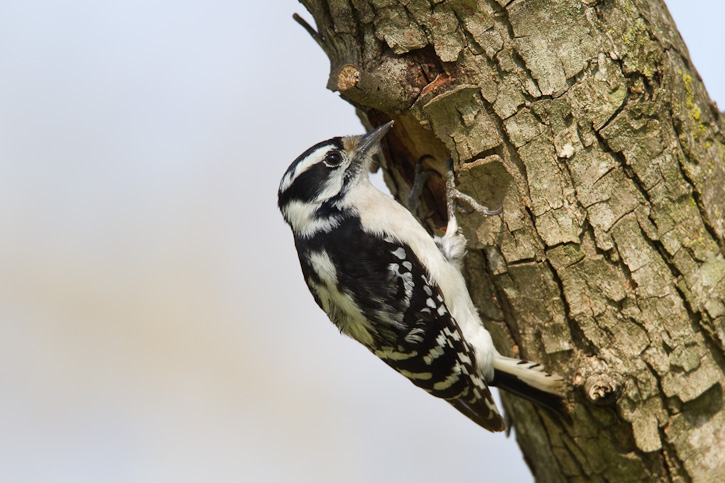 | The next 6 images show a female Downy Woodpecker investigating and working on a potential nesting cavity in Austin, Travis Co., Texas, in March, 2010. These images were taken with a Canon EOS 1D Mark IV and an EF 800mm F/5.6 L IS lens. | ![]() |