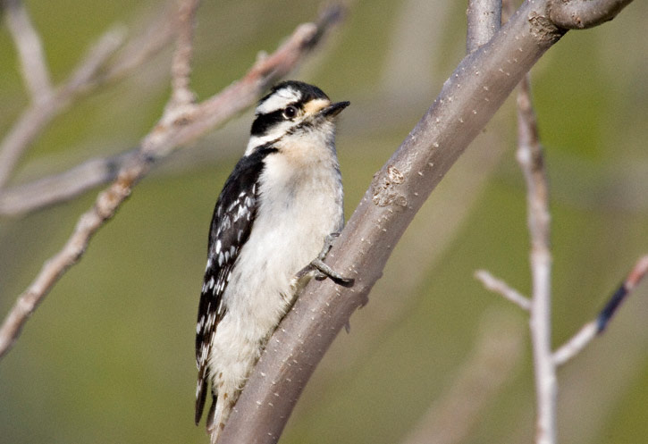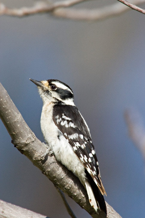 | The Downy Woodpecker (Picoides pubescens) is a resident species across most of the United States and Canada. It is a small woodpecker, but can be quite vocal and active, so it is often easy to find. The first 12 shots on this page were taken in Lipscomb, Lipscomb Co., Texas, in April, 2007, with a Canon EOS 1D Mark II and EF 600mm F/4 L IS lens and 2X extender. This pair of birds was quite active on this occasion and afforded many photo opportunities. The male has a splash of red on the back of the head. | ![]() |