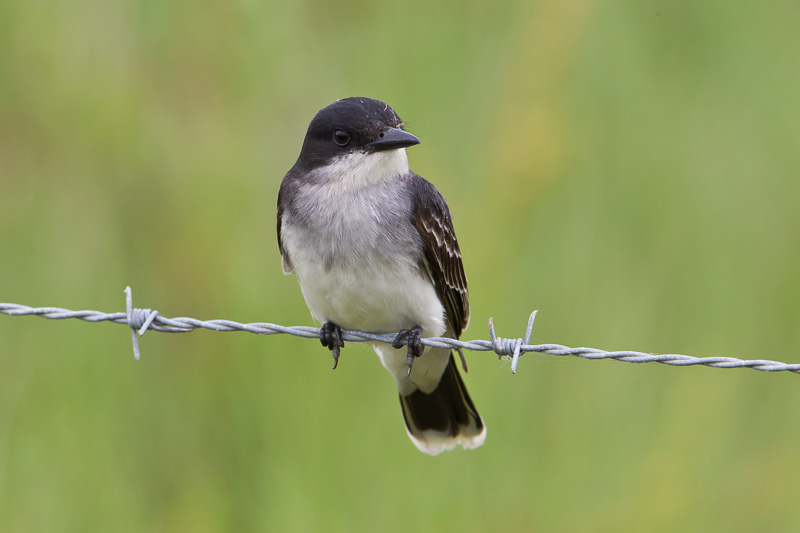 | The Eastern Kingbird shown here was perched on a barbed wire fence at the Pawnee National Grasslands, Weld Co., Colorado, in June, 2007. The image was taken with a Canon EOS 1D Mark III and EF 600mm F/4 L IS lens and 2X extender. | ![]() |