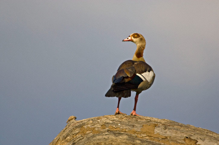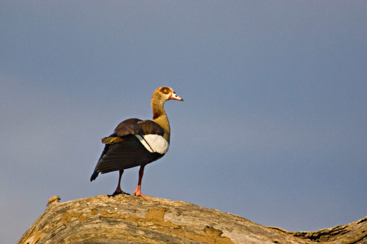 | The Egyptian Goose (Alopochen aegyptiacus) is an Africa species occurring in the Nile Valley and many other locales. The bird shown here was near the Satara Camp, Kruger National Park, Mpumalanga Province, South Africa, in January, 2006. The images were taken with a Canon EOS 1D Mark II and EF 500mm F/4 L IS lens and 2X extender. | ![]() |