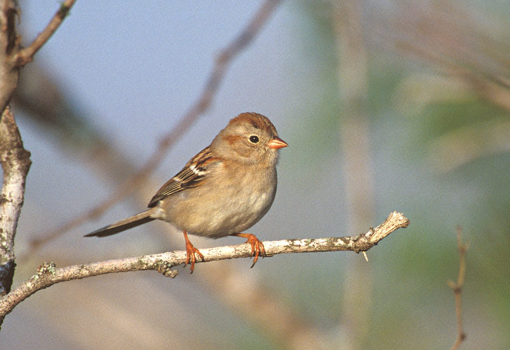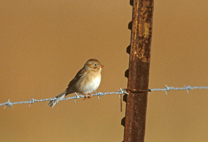 | Perhaps one of the most common views of a Field Sparrow is to see one perched on a fence wire along a roadside. This one was in Kenedy Co., Texas in January, 2000. This shot was taken with a Canon EOS 1N and EF 600mm F/4 L lens and 1.4X extender on Fuji Provia film. | ![]() |