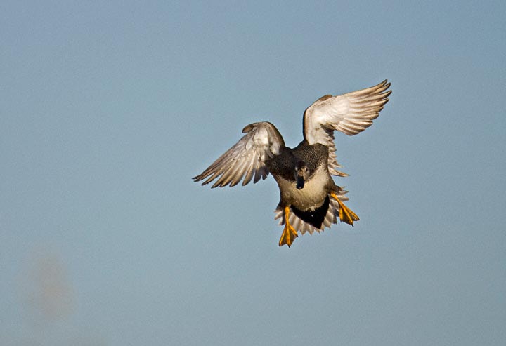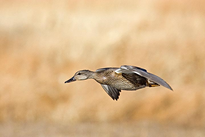 | The Gadwall (Anas stepera) is a widespread duck across all of North America. In general it breeds across much of the northern United States and Canada, and winters along both coasts and much of the southern U.S. and Mexico. The three shots shown here were taken at Bosque del Apache N.W.R., Socorro Co., New Mexico, in November, 2005. The shots were taken with a Canon EOS 1D Mark II and EF 600mm F/4 L IS lens and 1.4X extender. A male is shown on the immediate left as he comes in to land, while two shots of females in flight are just below. |  |