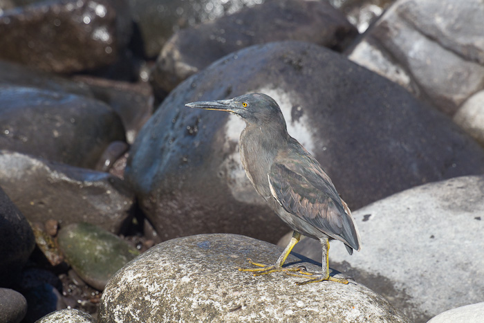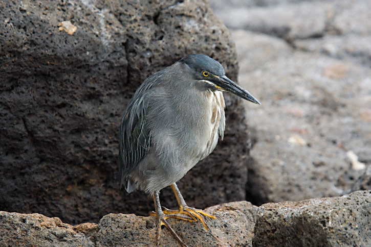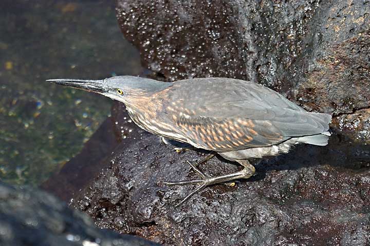 | The Galapagos Heron (Butorides sundevalli) is another species endemic to the Galapagos Islands. It is also known as Lava Heron, and is now apparently "lumped" with Striated Heron. It is closely related to the Green Heron more familiar to North American observers and shares similar behavior. The first 2 shots on this page were digital captures taken in July, 2003, on James Island with a Canon EOS 10D and an EF 70-200 mm F/2.8 L IS lens and 2X extender. The 2nd shot shows an immature individual with considerable buffy or rufous feathers visible on the wing; in the adult these are all gray. |