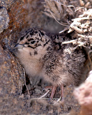 The Gray-breasted Seedsnipe (Thinocorus orbignyianus) occurs in the Andes of Peru and into Argentina and Chile. The photos presented here are of a one-day old chick (from a clutch of four) near El Yeso Reservoir, Chile. The adult was nearby. The photos were taken on 13 January 1999 with a Canon EOS 1N & EF 300mm F4L IS lens with fill flash mounted on a gunstock. The film was Fuji Sensia 100. The four chicks were hiding under rocks and brush at the edge of a dirt road. I suspect there are very few photos of this species at this age. | ![]() |