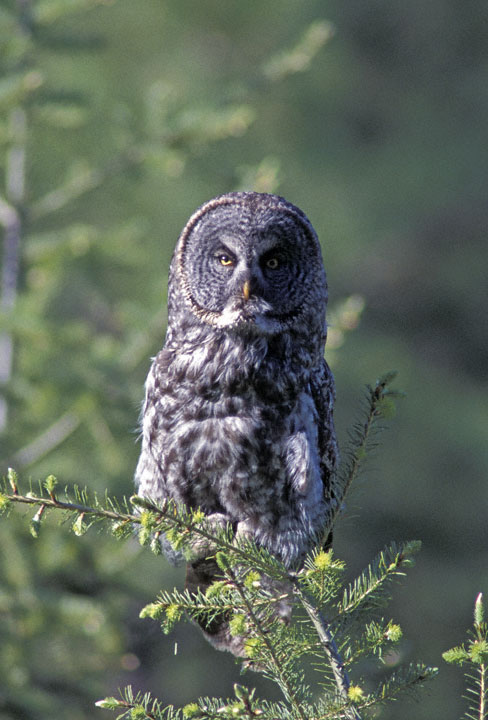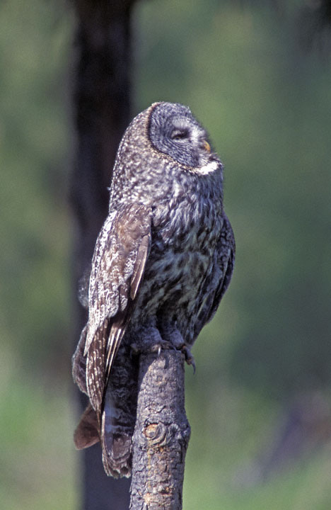 | The Great Gray Owl (Strix nebulosa) is truly a creature of the far north. The species is resident across much of Canada and breeds in the Pacific Northwest areas of the United States as well. It is generally considered the largest North American owl. The bird pictured on this page was one of a pair feeding young near Havillah, Okanogan Co., Washington in June, 1998. The photos were taken with a Canon T-90 & FD 400mm F4.5 lens on a BushHawk shoulder mount with Fuji Sensia 100. This owl was found while I was co-leading a VENT trip with Bob Sundstrom. I wrote an article for the VENT newsletter regarding these owls and the trip which may be of interest. | ![]() |
