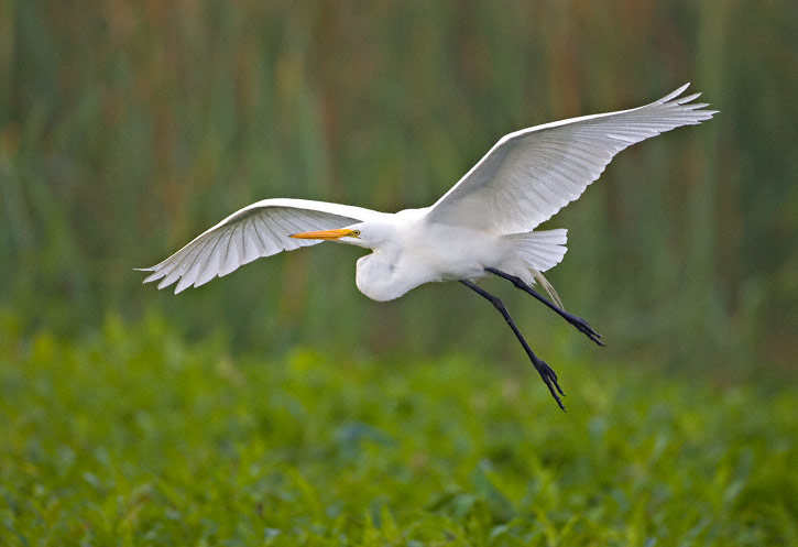 | The Great Egret in flight on the right was at Lake Tohopekaliga, Osceola Co., Florida, in February, 2007.This shot was taken with a Canon EOS 1 D Mark II and EF 500mm F/4 L IS lens. |