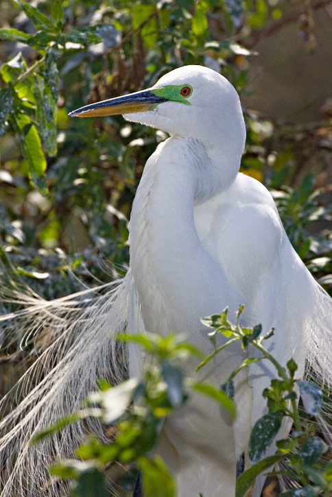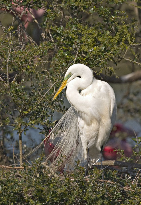 | The next four images were taken at the same location and time as the flying egret shot just preceding. This was a breeding plumaged Great Egret near a nest which was under construction. It was mid-day and the bird was backlighted, but still made for some interesting shots. |