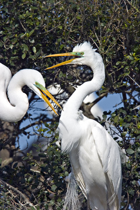| The next two digital shots here, of breeding birds, were taken at a rookery in High Island, Galveston Co., Texas, in March, 2004, with a Canon EOS 10D and EF 600mm F/4 L IS lens. The green facial skin is only seen during the courtship period. |