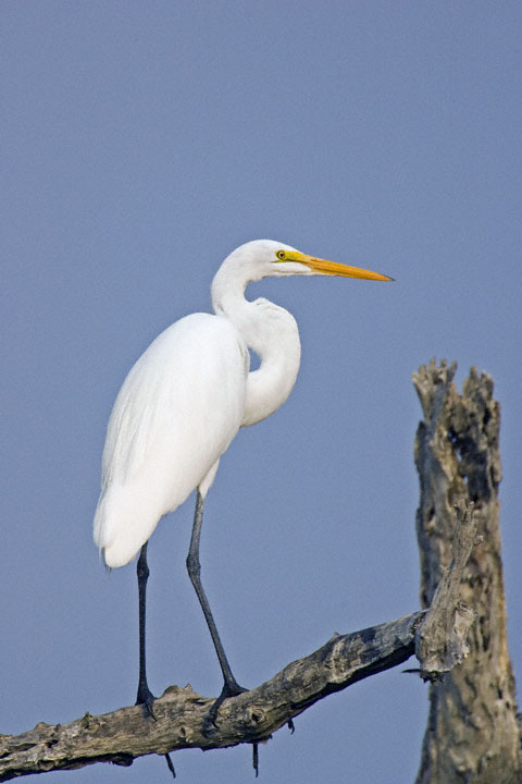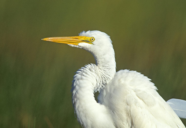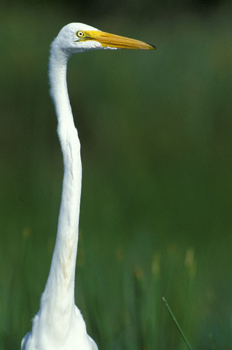 | The Great Egret (Ardea alba) is another one of those birds familiar to people across most of the United States. Its common name has, at various times, been Common Egret, American Egret, and Great Egret, with the latter being in use today. It is a tall, slender, wading bird that is often a familiar sight at a pond edge, especially in the south. The shot at right and the following two were taken in Kenedy Co., Texas, in spring, 2000, with a Canon EOS 3 and EF 600mm F4 L lens on Fuji Sensia. |