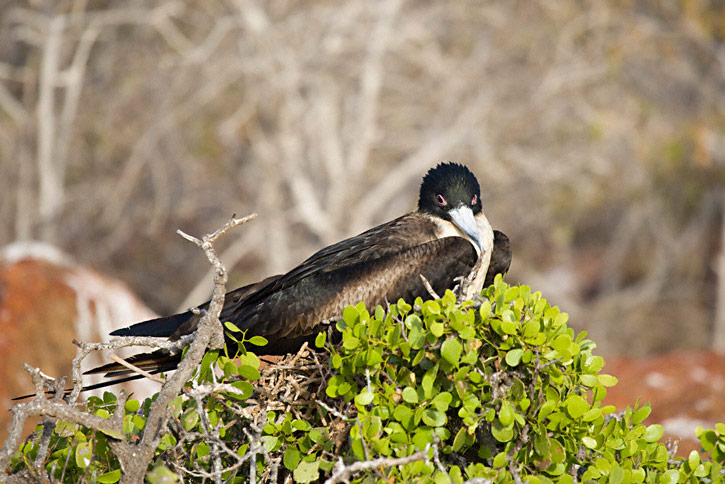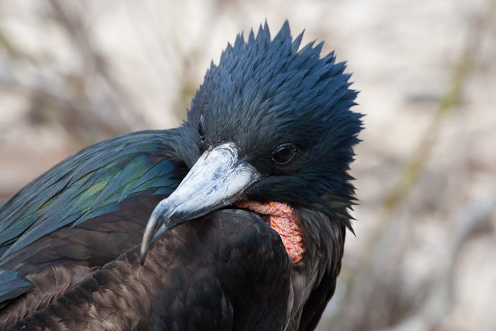 | The next three shots of Great Frigatebird were taken on Tower Island in the Galapagos, in August, 2010, with a Canon EOS 1D Mark IV and a Sigma 50-500mm lens. The bird in the first two shots is a female. |