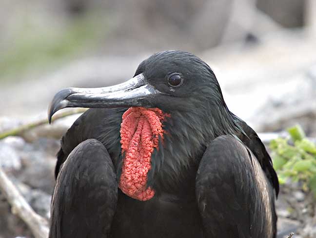 | The Great Frigatebird (Fregata minor) nests on Tower Island in the Galapagos which is where the top 3 images on this page were taken. The first photo shows a male in breeding display with his inflatable pouch blown up. Next is a shot of another mail "deflated". The digital photos shown here were taken in July, 2003, with a Canon EOS 10D and an EF 70-200 mm F/2.8 L IS lens. |