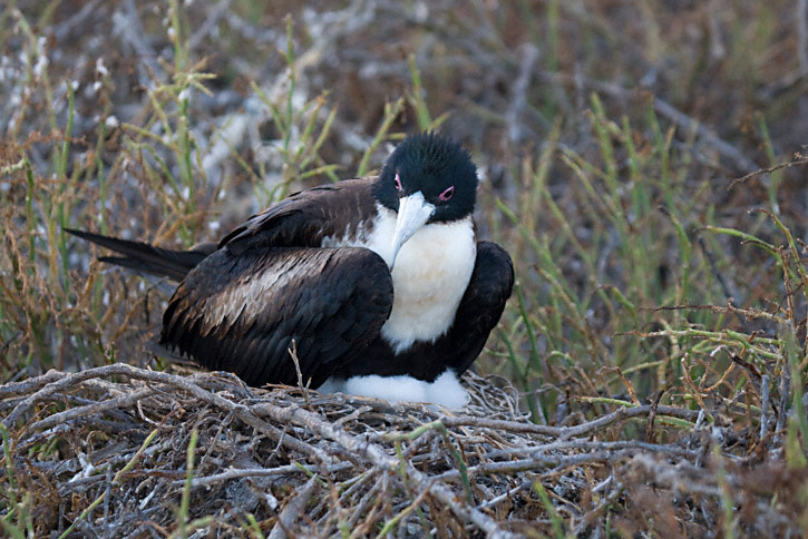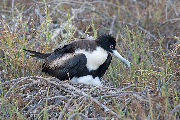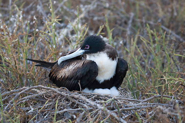 | On the right are 7 more images of female Great Frigatebirds from the Galapagos. These shots were taken in July, 2007, on Seymour Island, with a Canon EOS 1D Mark III and EF 100-400mm F/4.5-5.6 L IS lens. The female in the first 3 shots shown here is at a nest with a downy chick. |