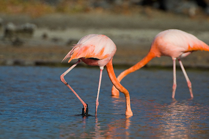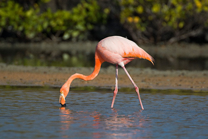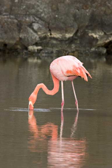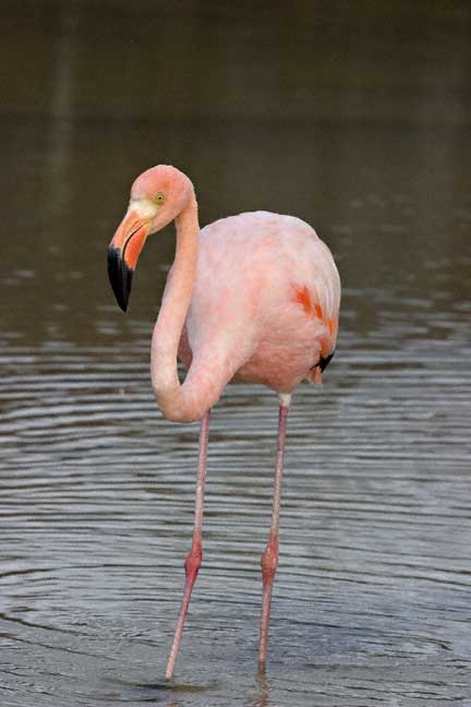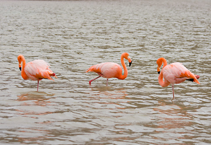 | The Greater Flamingo (Phoenicopterus ruber) occurs in the Caribbean and can sometimes gather in large numbers along the coast of Yucatan, Mexico. The species is a rare visitor to the United States and has been recorded a few times in Florida and Texas. The birds in the shot at right were photographed in August, 2000, near Rio Lagartos, Yucatan with a Canon EOS 1N and EF300mm F2.8 lens with a 1.4X extender from a Gitzo tripod on Fuji Velvia pushed one stop. The next 4 shots on this page were digital captures on the Galapagos Islands in July, 2003, with a Canon EOS 10D and an EF 70-200mm F/2.8 L IS lens. Scroll down for more images. |