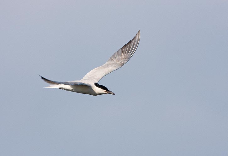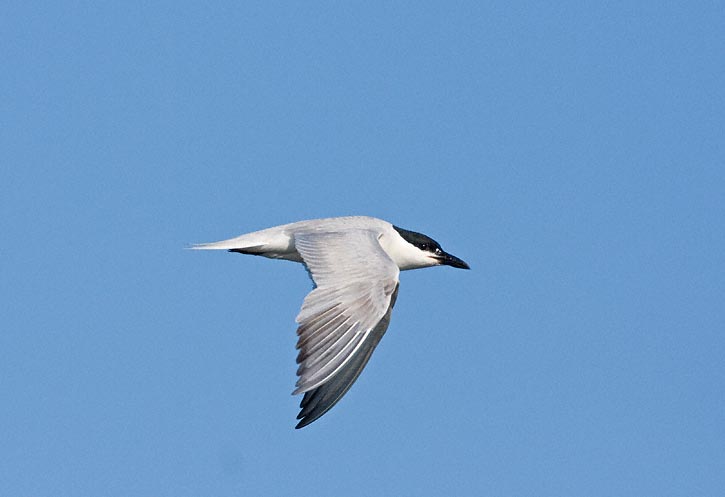 | The Gull-billed Tern (Gelochelidon nilotica) is a widespread coastal tern found along all along the Atlantic and Gulf of Mexico coasts of the United States. The species is also found in parts of California and Mexico. It is somewhat more stocky in build than many of our other terns and has a thicker and somewhat shorter bill than many other species. The Gull-billed Terns in flight in the top 6 images shown here were at Anahuac N.W.R., Chambers Co., Texas, in June, 2008. These shots were taken with a Canon EOS 40D and an EF 500mm F/4 L IS lens. | ![]() |